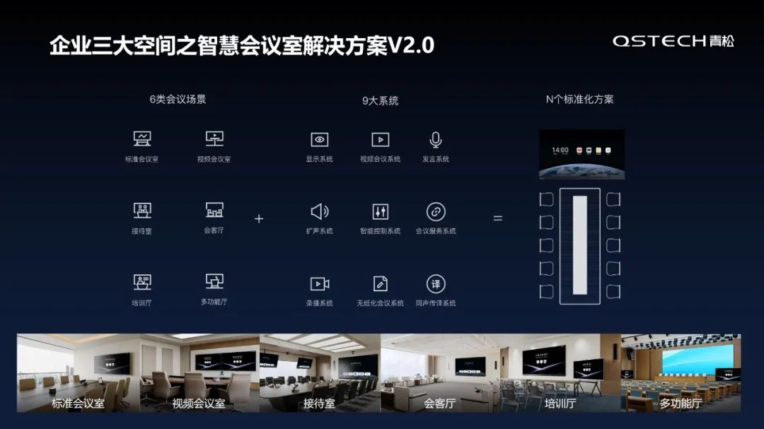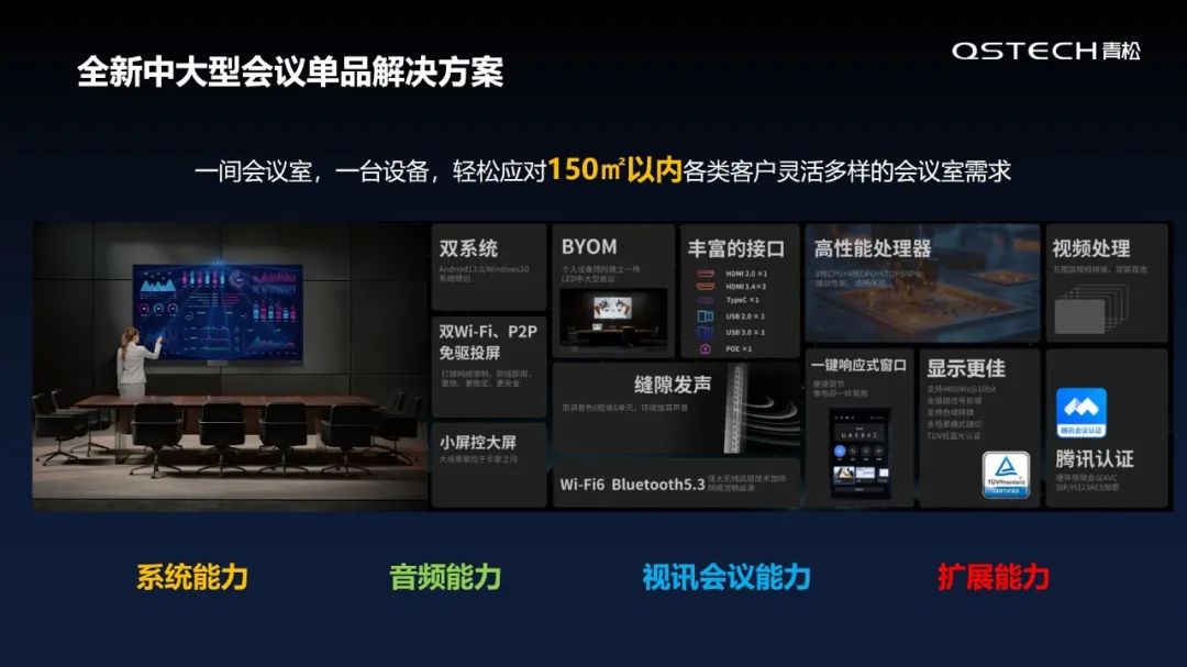 由于近几年办公方式快速转变,不同行业客户的需求难标准,为优化信号传输兼容性、系统复杂性和中控操作不便等问题,青松进行了大规模场景分析,总结出三点变革:硬件高集成融合、更简化配置逻辑和聚焦前沿应用生态。